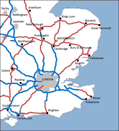 The main roads for Waterbeach are the M11 from London and the A14 running east/west from the Suffolk docks to the Midlands. Waterbeach itself is just off the A10 between Cambridge and Ely.